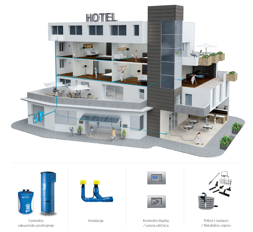 Centralni sustav za usisavanje (za profesionalnu upotrebu) koristi se za standardna i namjenska usisavanja velikih stambenih, poslovnih i industrijskih prostora (objekata).